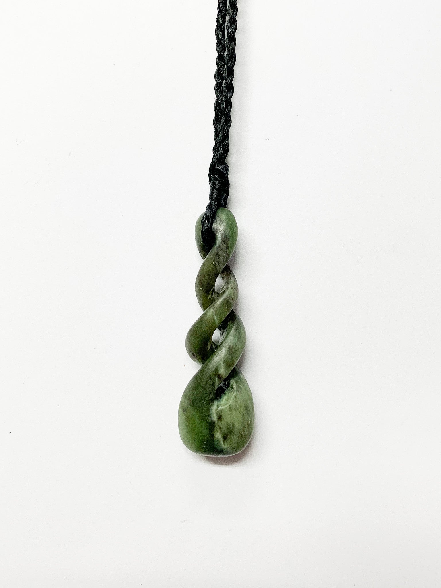 This medium Pikorua/Twist has been crafted by hand in our Oro Negro Studio on Karangahape Road out of New Zealand Kahotea Pounamu stone from the West Coast of the South Island. This piece has been finished off with an adjustable 4-plaited black waxed cord.