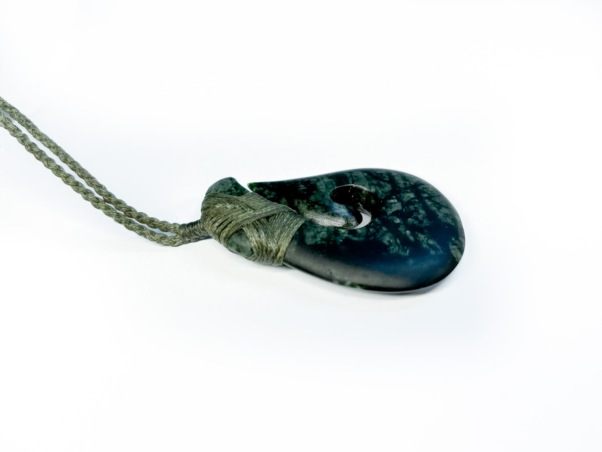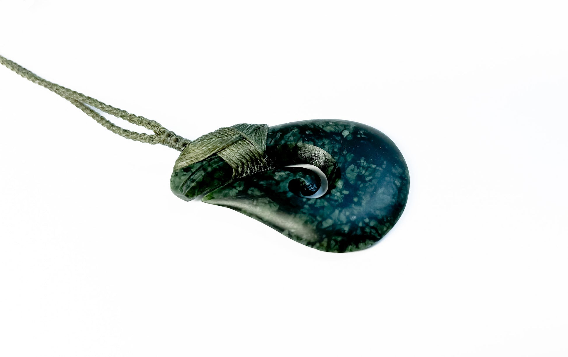 Handcrafted by our team at Oronegro jewellery, this Hei Matau is carved out of a unique, almost black pounamu with green speckles. The piece is bound with a sage-coloured 4-cord braid binding.