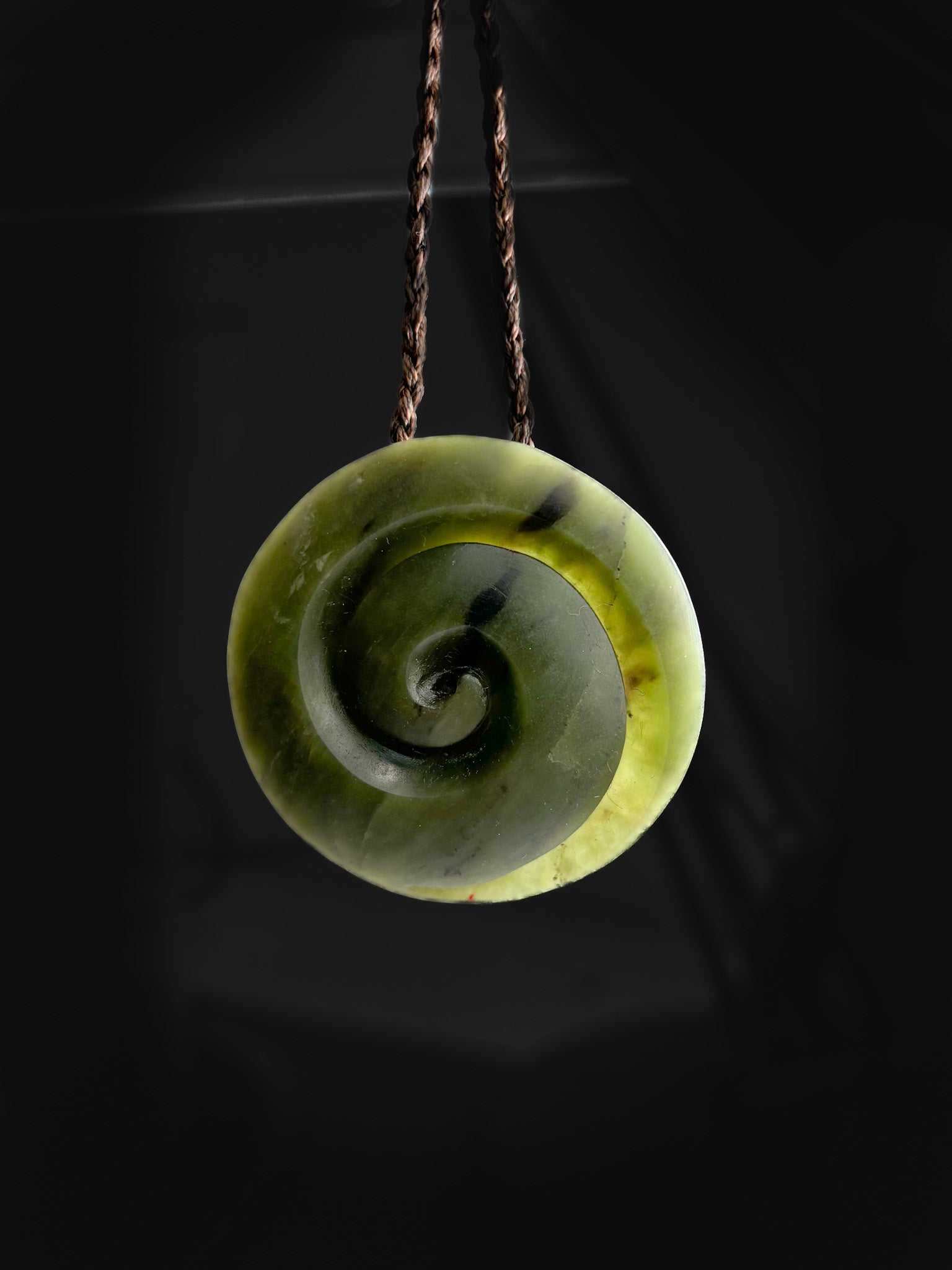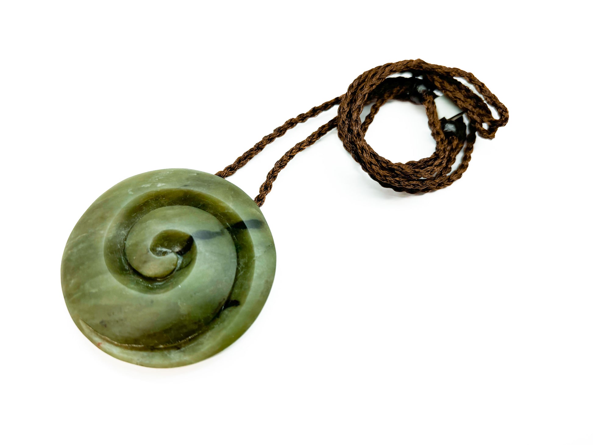 This elegant Koru carving was lovingly crafted by our artisans at our Karangahape studio. The Kawakawa piece is bound with a dark brown coloured 4-cord adjustable braid.
