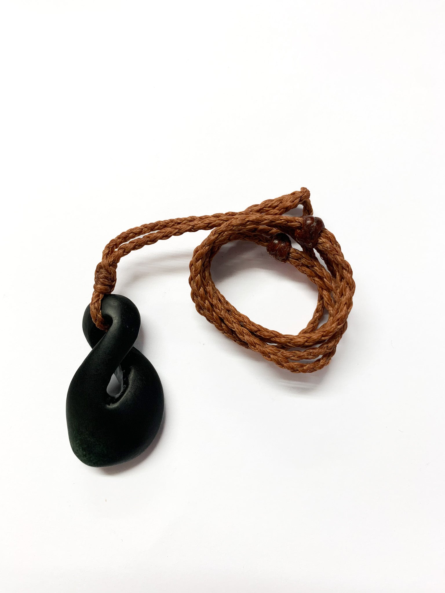 Medium sized Pikorua Pounamu finished off with a 4-cord wax binding in a terracota colour. (L38 x D9 x W21) mm