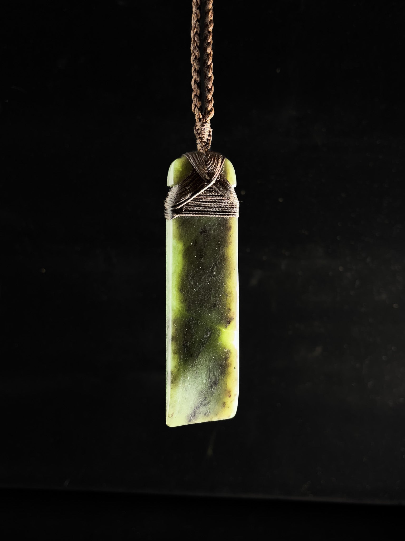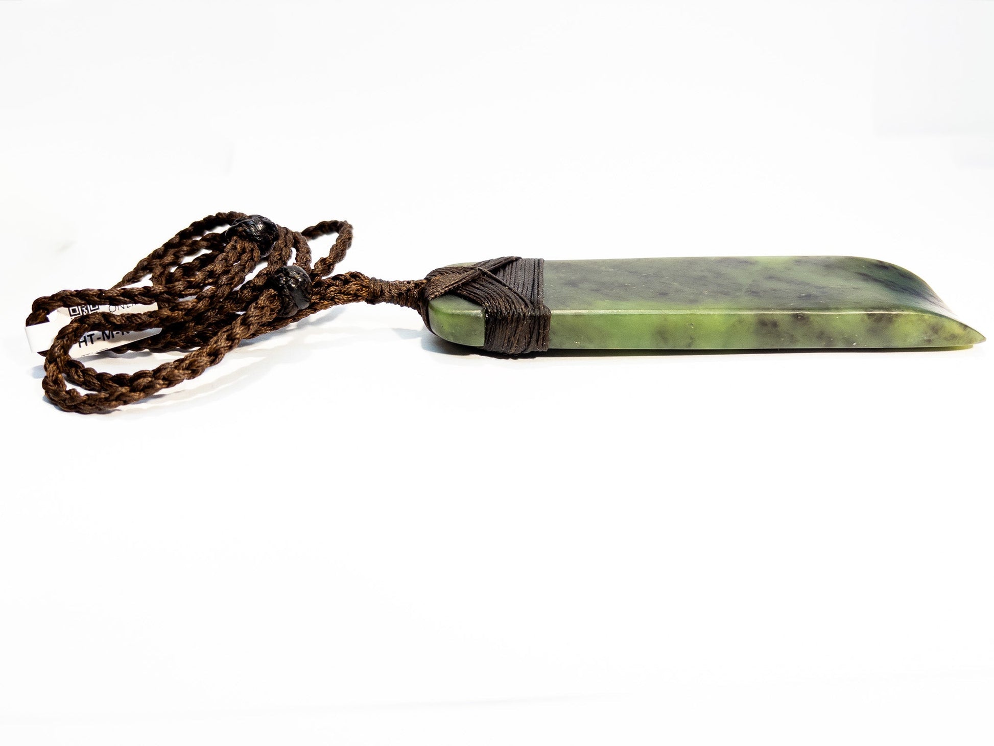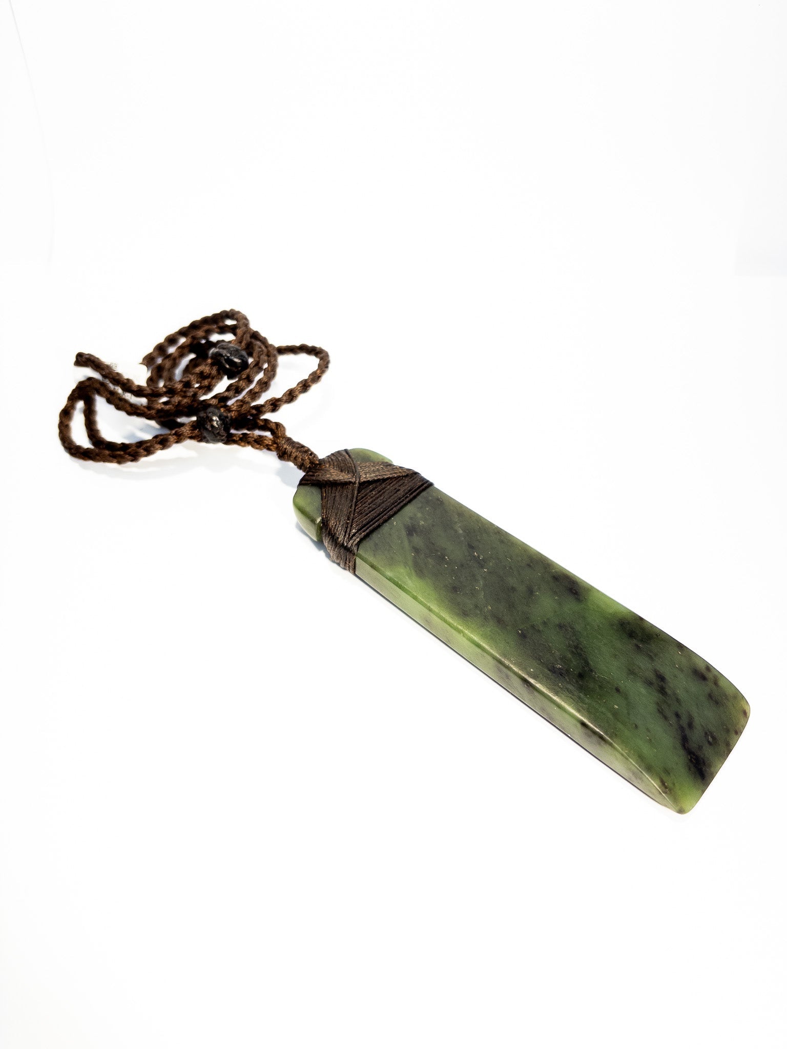 Handcrafted by our team at Oronegro jewellery, this large Hei Toki-Pikorua pendant is carved out of a stunning Aohunga pounamu with a variety of coloured stripes. The piece is bound with a thick brown coloured 8-cord braid binding.