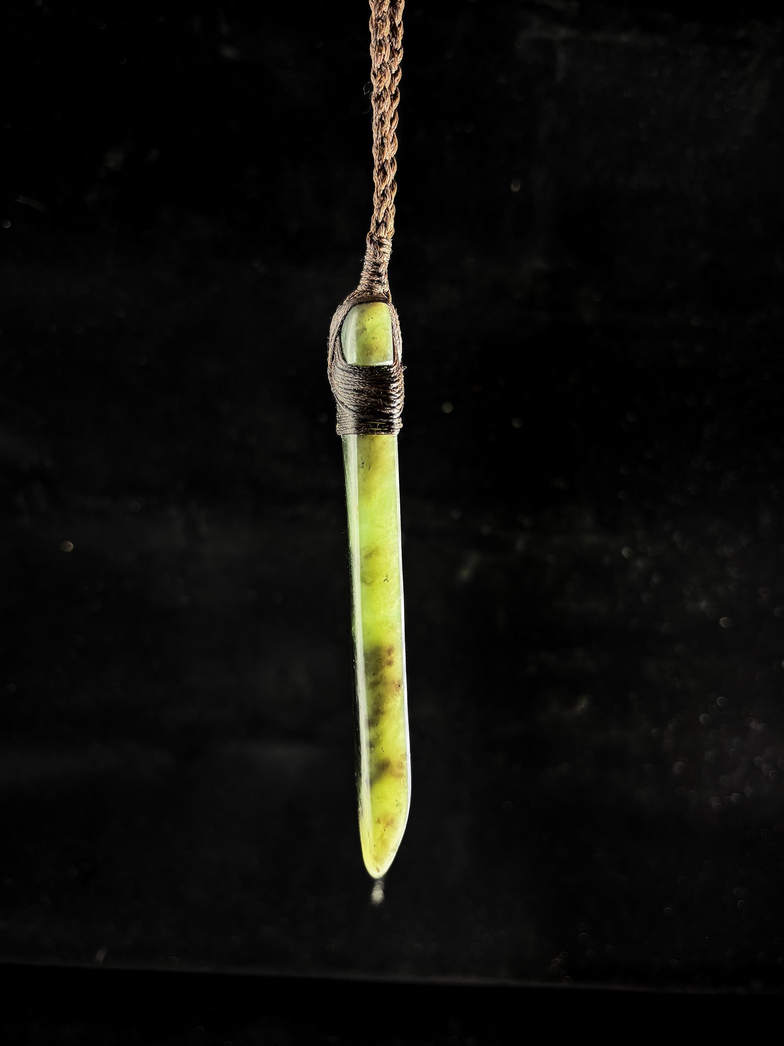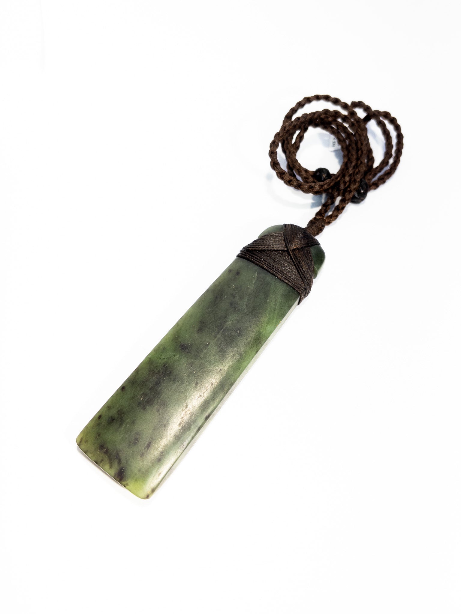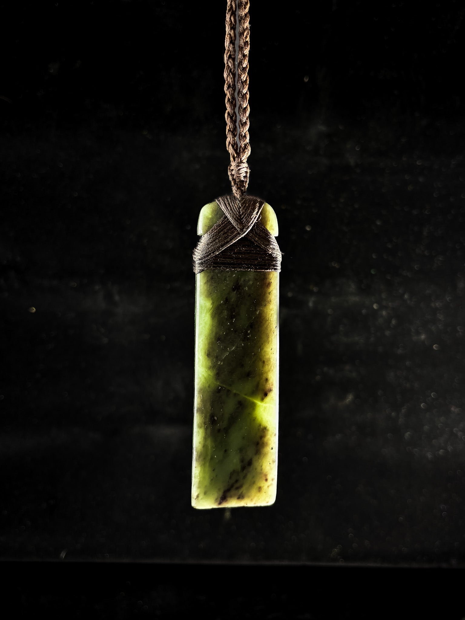 Handcrafted by our team at Oronegro jewellery, this large Hei Toki-Pikorua pendant is carved out of a stunning Aohunga pounamu with a variety of coloured stripes. The piece is bound with a thick brown coloured 8-cord braid binding.