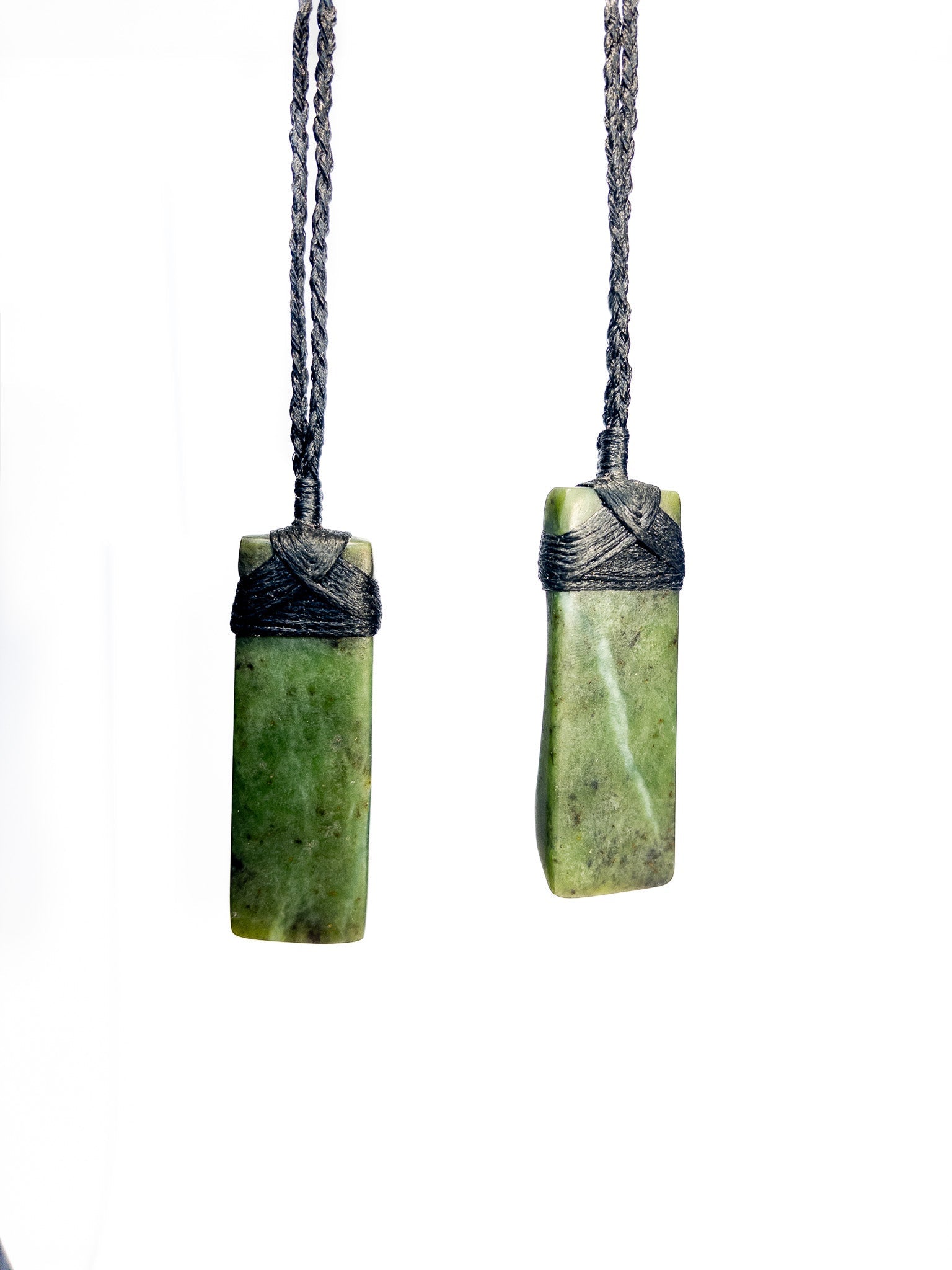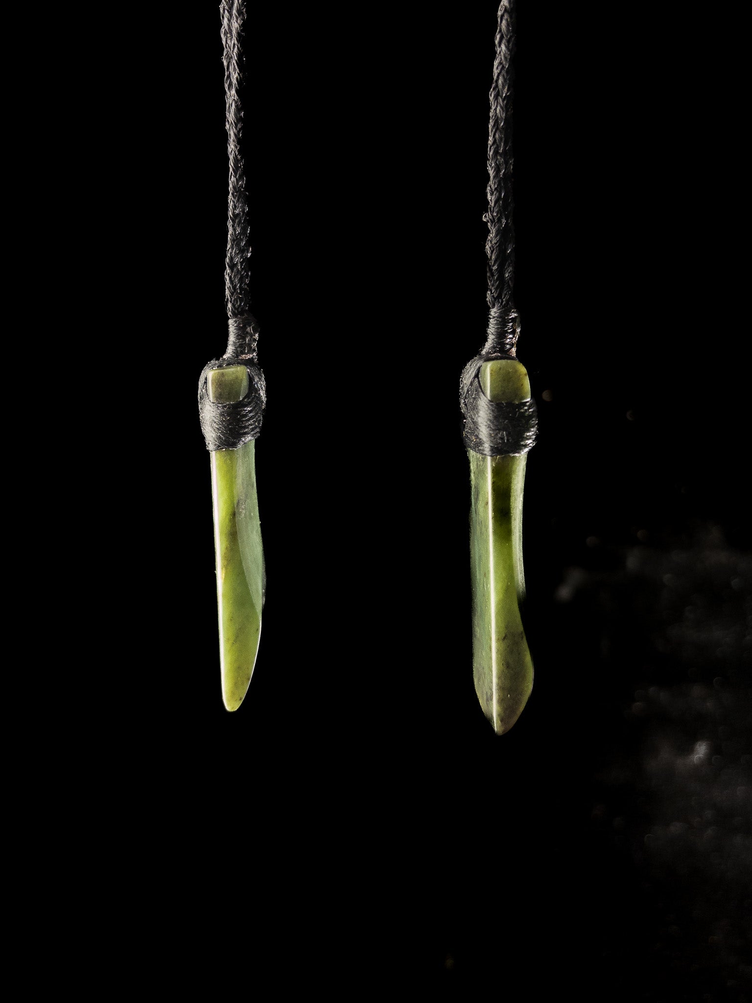 Handcrafted by our team at Oronegro jewellery, this Hei Toki Twin Pendant set is carved out of a stunning pounamu with a variety of coloured markings. Each piece is bound with black coloured 4-cord braid binding.
